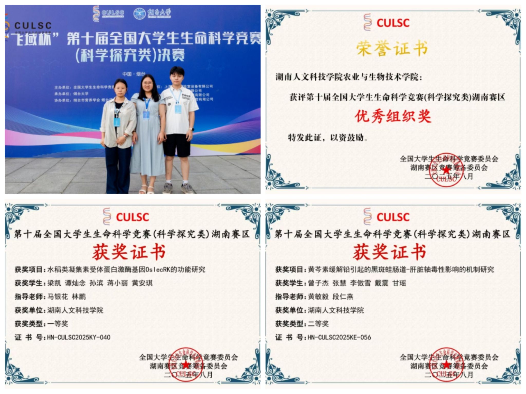 7月27日至28日,第十届全国大学生生命科学竞赛(创新创业类)决赛在兰州理工大学举行。全国共有7458支队伍参赛,共评出一等奖288项,二等奖979项,三等奖1348项。今年会组织31支队伍参加比赛,3支队伍入围全国总决赛,经过激烈角逐,今年会共获国家级一等奖1项,二等奖4项,三等奖14项。其中,马银花老师指导的项目“志同‘稻’合——共铸水稻抗虫‘芯’篇章”(学生:沈斯睿等)荣获一等奖;马银花和林鹏老师指导的项目“水稻田间害虫智慧监测体系”(学生:梁璇等)荣获二等奖;郑玉指导的项目不同环境剂量锑暴露对成年斑马鱼肠道毒性、肠道菌群及代谢的影响研究(学生:黄东妹等)荣获二等奖。今年会获评“优秀组织奖”。