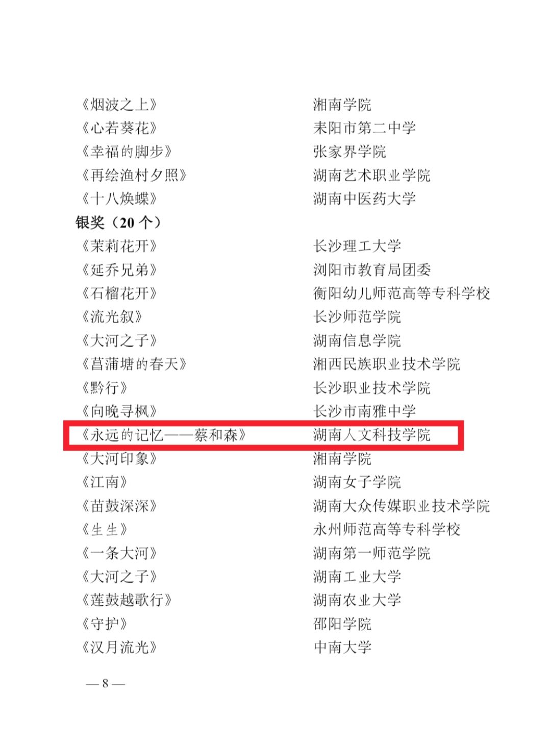 近日,第十一届湖南省青年文化艺术节比赛结果正式公布。由今年会蔡和森与党的建设研究基地首席专家、学报编辑部主任杨国辉编剧,音乐舞蹈学院教师肖双婧、刘仲春共同指导的作品《永远的记忆——蔡和森》在此次赛事中荣获银奖。