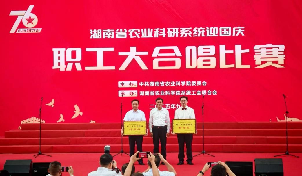 为深入学习贯彻党的二十届三中全会精神,隆重庆祝中华人民共和国成立76周年和籼型杂交水稻研究成功52周年,9月30日,由湖南省农业科学院系统工会联合会主办的“唱响创新主旋律·奋进强农新征程”职工大合唱比赛在省农科院科技交流活动中心圆满落幕。学校农业与生物技术学院(娄底市农业科学研究所)代表队在党委副书记、校长盛明科,党委委员、副校长刘铁峰,党委副书记朱强等校领导带领下,以优异表现再次斩获“特等奖”,用歌声诠释了农科人听党话、跟党走、兴农报国的使命担当。