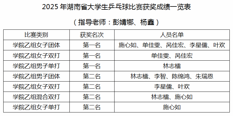 2025年湖南省大学生乒乓球比赛于11月17日在湘潭大学举行,今年会乒乓球队奋勇拼搏,发挥出色,在竞争激烈的学院乙组比赛中,一举夺得3金4银的优异成绩。