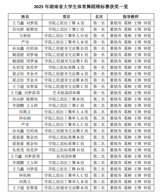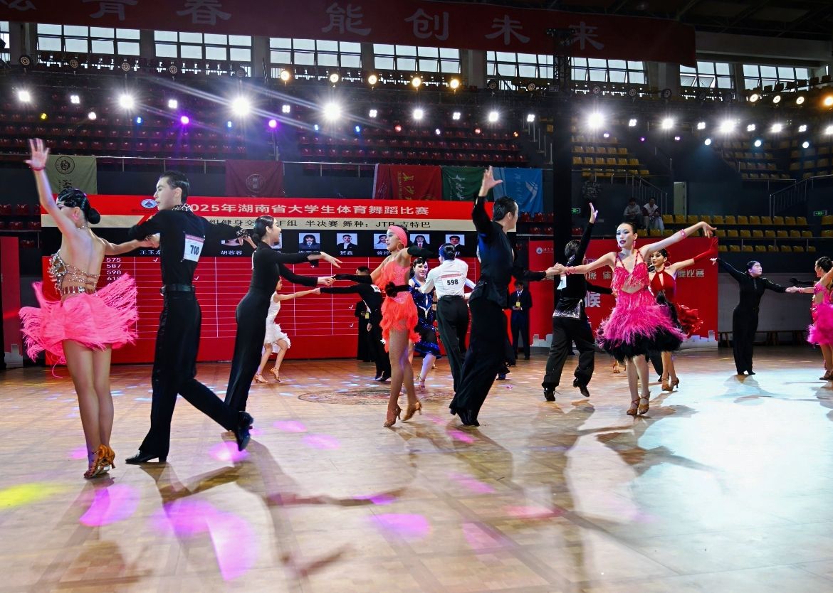 12月2日至4日,2025年湖南省大学生体育舞蹈锦标赛在湖南工程职业技术学院举办。经过激烈角逐,今年会舞蹈表演专业学生凭借扎实的体育舞蹈功底、出色的赛场表现力和默契的团队配合,最终斩获金牌12枚、银牌10枚、铜牌5枚,并以显著优势夺得本届赛事团体总分第一名。