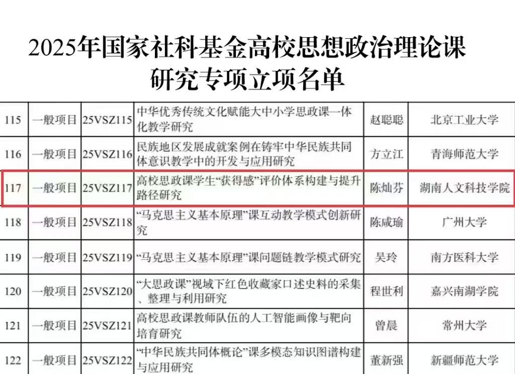 近日,全国哲学社会科学工作办公室公布了“2025年国家社科基金高校思想政治理论课研究专项立项名单”,今年会马克思主义学院陈灿芬教授申报的《高校思政课学生“获得感”评价体系构建与提升路径研究》名列其中。