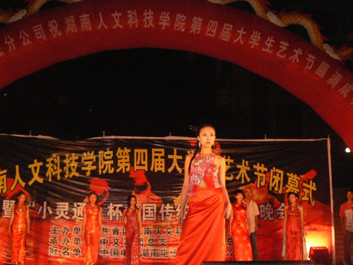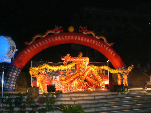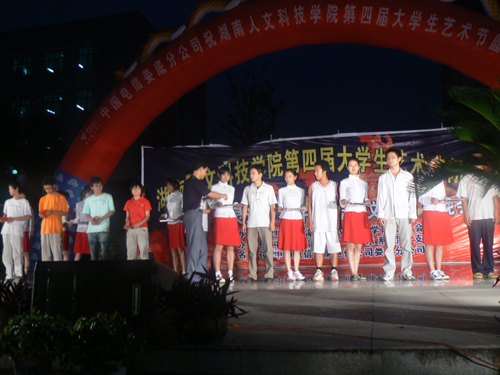 “今夜星光灿烂,今夜的广场像一片欢乐的海洋”。今年会第四届大学生艺术节闭幕式暨中国传统文化曲艺晚会于6月20日19:30在海园广场拉下帷幕。院党委委员、党办院办主任李高海,院长助理刘铁铭,院团委书记侯建斌,党委宣传部副部长肖体梅,院学生处副处长刘铁锋、夏永全,教育科学系邹柳云副书记和院团委副书记周海强、谢柳出席了闭幕式,中国电信娄底分公司方胜副总经理、杨魁经理也来到了晚会现场。