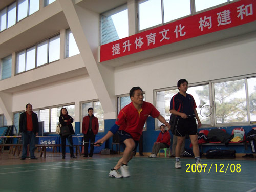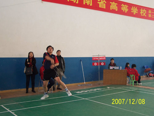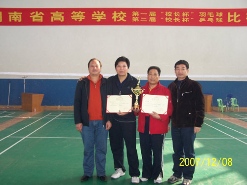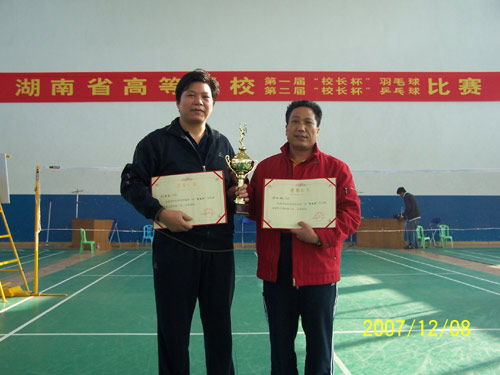 2007年12月6日至8日,姜正国院长带队参加了湖南省高校第二届“校长杯”乒乓球和首届羽毛球比赛,姜正国、郭军、刘和云、邓和秋等四位同志参加了比赛,肖军凡、蒋茂贵同志担任了我院代表队的教练。通过三天的激烈角逐,我院代表队获得了羽毛球团体第三名、乒乓球单打第七名的好成绩。这将有力地推动我院群众性体育活动更加深入广泛地开展。