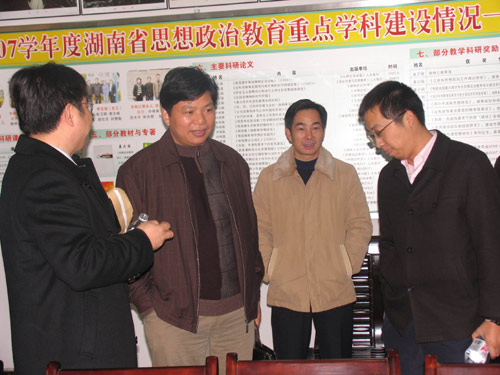 12月17日上午,省“十一五”重点建设学科检查组专家省教育厅厅长助理、湖南商学院夏飞教授,湖南师范大学马克思主义教育学院副院长方小年教授,中南林学院佘济云教授,省教育厅科技处潘军一行4人来我院检查指导重点学科建设情况,并在办公楼会议室与我院院长姜正国教授,副院长刘和云教授以及各重点建设学科负责人举行了交流汇报会。