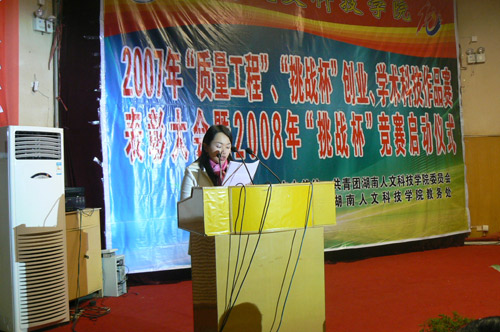首先,院团委副书记谢柳同志做了题为《青春与创新共舞,人文与挑战同行》的2007年学生科技创新工作的总结,表达了院团委决战2008,冲击省级“挑战杯”金银奖而不懈努力的决心。