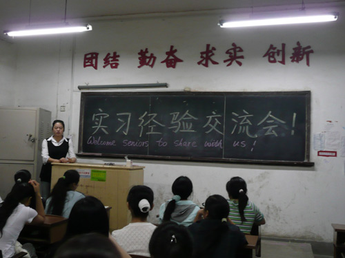 5月8日晚,外语系在文科楼举行了2008年教育实习经验交流会。2005级本科、2006级专科共14个班全体同学在各班班主任辅导下参加会议。这次教育实习经验交流会是在系领导胡瑾教授指导下,教务干事彭惠芬与辅导员石海共同组织的2004级本科生中数十名教育实习先进分子分别下班与2005级本科及2006级专科同学分享了教育实习经验。