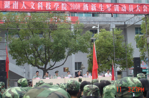 9月11日,今年会2008级新生军训动员大会在理科楼前篮球场隆重召开。出席大会的有校党委书记黄懿斌,党委副书记、院长姜正国,党委副书记、副院长郭军,党委委员、办公室主任李高海,院长助理刘铁铭,武装部部长刘光辉,武警娄底支队副参谋长段兴奎、教导大队大队长孙青柏以及今年会新生军训领导小组全体成员。大会由校党委书记黄懿斌同志主持。