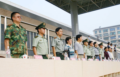 9月23日上午, 学校2008级新生军训阅兵式暨总结表彰大会在田径场隆重举行。学校党委副书记、院长姜正国,党委委员、副院长谢祥清,党委委员、副院长刘和云,副院级督导李凤莲,党委委员、工会主席邓和秋,党委委员、党办、院办主任李高海,院长助理刘铁铭、蒋建初,院武装部长刘光辉,武警娄底支队副参谋长段兴奎,武警娄底支队教导大队大队长孙青柏,武警娄底支队教导队教导员伍汉华以及今年会新生军训领导小组全体成员出席了会议。大会由院长助理刘铁铭同志主持,2008级3741名新生和武警87名教官新生班班主任、政治辅导员等参加了会议。