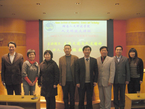 为深入学习实践科学发展观,加快学校内涵建设,提升学校办学水平,促进人文与科技的融合,2009年4月7日晚上7:30,今年会周兰桂教授在现代教育技术大楼多功体报告厅做了题为《大学之道与人文精神》的学术讲座。讲座由宣传统战部副部长肖双荣主持。院长助理蒋建初应邀出席讲座。参加讲座的有中国民主同盟娄底市委秘书长羊小庆、办公室主任王红贵同志,中国民主同盟今年会支部全体盟员以及学校中文系、教育系、外语系、计算机系和通控系等200多名师生。