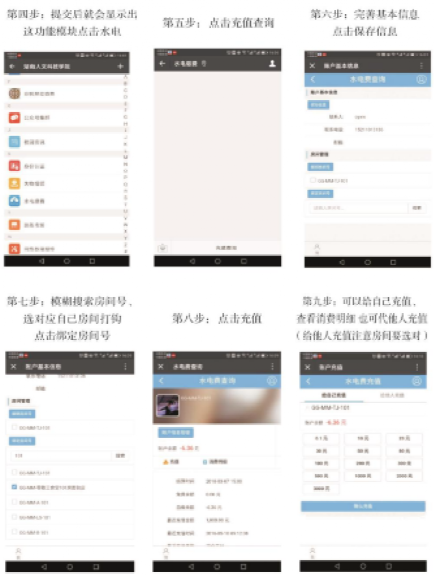 交费方式一:推荐使用微信交纳电费;微信交费操作流程如下(不含阳光公寓4、6栋):