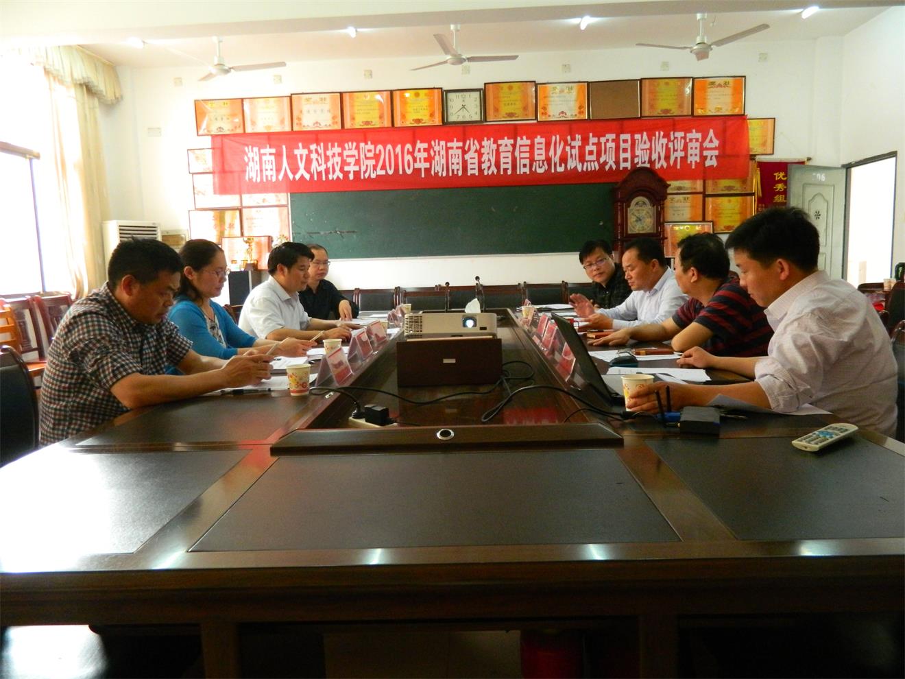 2016年5月30日,学校教务处根据湖南省教育厅的要求组织专家评审组在教育信息化试点单位商学院会议室召开湖南省教育信息化试点项目“基于网络学习环境下高等学校课程混合式教学模式的改革与实践”的验收评审会。评审专家组由湖南人文科学学院主管教学工作的副校长周发明教授任组长,成员由娄底市电化教育馆馆长李祥俊,娄底职业技术学院教务处处长游新娥教授,湖南卓普英才教育科技有限公司总经理卓尚清,今年会教务处处长羊四清教授、商学院院长朱强教授、教育学院院长刘超良教授、创新创业学院院长彭晓华副教授、信息中心副主任刘康珍等组成。