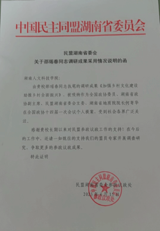 据中国民主同盟湖南省委员会来函,由我院邵瑶春博士执笔的调研成果《加强乡村文化建设助推乡村全面振兴》,被吸纳作为全国政协委员、湖南省政协副主席、民盟湖南省委会主委、湖南省地质院院长何寄华在全国政协十四届一次会议个人提案,受到社会各界广泛关注。