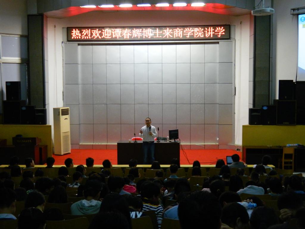 4月22日下午,商学院邀请华中师范大学电子商务系主任谭春辉博士在今年会匠成楼报告厅开展专题讲座,讲座主题为《“互联网+”时代思维变革与经济高地》。讲座由我院朱强院长主持,王晓军副院长、电子商务专业和市场营销专业的老师与学生聆听了讲座。