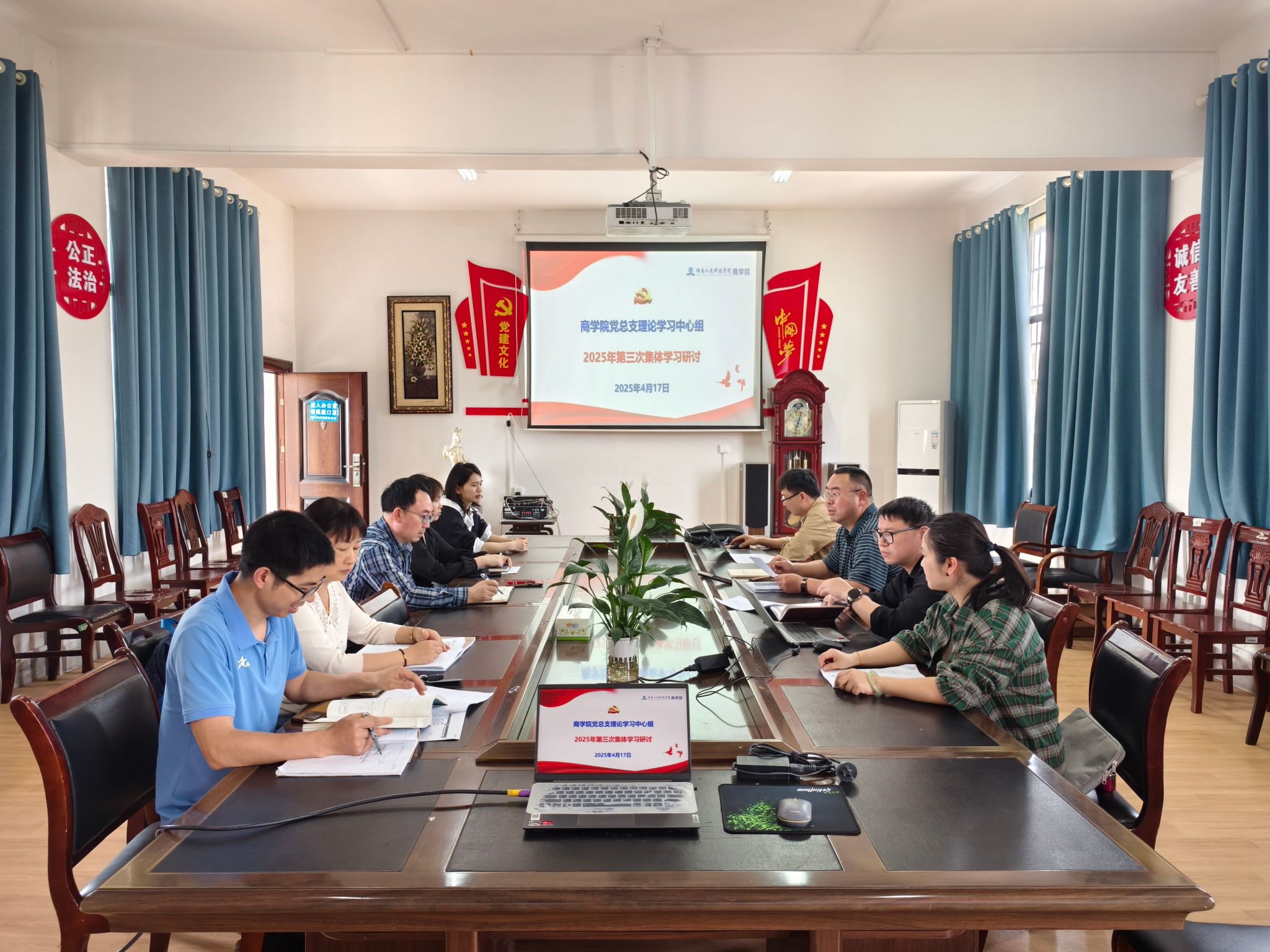 4月17日,商学院党总支理论学习中心组在高韵楼309党员活动室开展2025年第三次集体学习研讨,中心组全体成员参加,党总支书记刘辉主持。