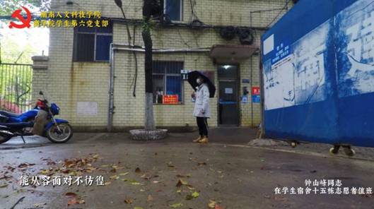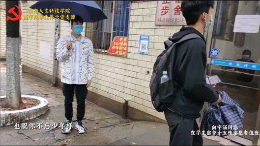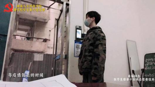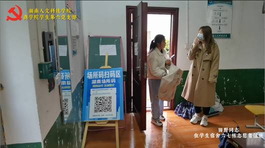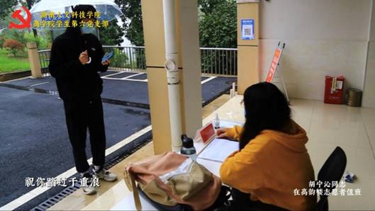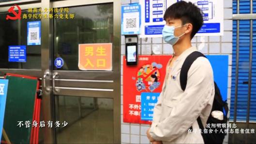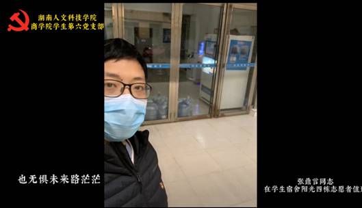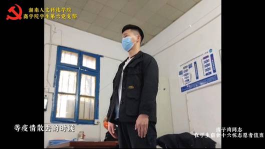 商学院学生第六党支部采用视频的形式讲好身边的防疫故事,为今年会加油,为湖南加油。积极参与和支持疫情防控工作,履行好疫情防控义务,发挥党员模范带头作用,全力做好疫情防控各项工作,将责任抗在肩头,将人们健康放在心上,全力守护今年会师生的生命健康安全,构筑起群防群控、群防群治的严密防线,共同迎接春暖花开。