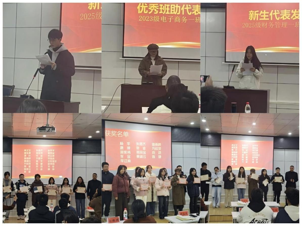 胡益龙为全体新生班班主任助理逐一颁发聘书。团总支书记刘佳瑶为杨李、朱思齐、李宜等13名获评“优秀班主任助理”的同学颁发荣誉证书,并寄予工作期望。优秀新生班班主任助理代表、2023级电子商务专业曾雨婷同学分享了自己从初任时的手足无措到从容应对问题的工作感悟与成长经历。2025级电子商务专业唐浩雄同学和财务管理专业周圆圆同学作为新生代表,分别讲述了班主任助理在学习指引、生活关怀方面给予的帮助,展现了双方间双向奔赴的温暖。