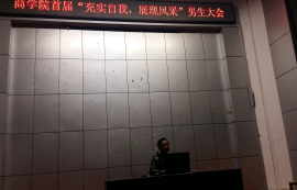 12月8日晚7点30分,商学院首届“充实自我,展现风采”男生大会在匠成楼报告厅隆重召开。出席本次活动的有娄底康一馨医院副院长邵艳红主任医师,学工处李玲军副处长,商学院党总支刘辛田书记,刘红燃副书记,辅导员熊峰老师,以及商学院15、16级全体男生。