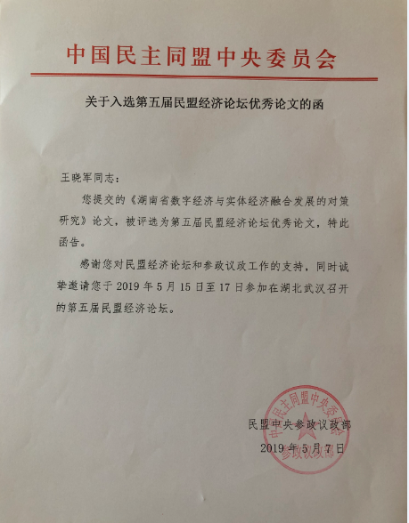 2019年5月16日-17日,由民盟中央经济委员会、民盟中央科技委员会、民盟湖北省委员会主办的第五届民盟经济论坛在湖北武汉市隆重举行。此次论坛以“推动数字经济与实体经济深度融合促进经济高质量发展”为主题。全国政协常委、副秘书长、民盟中央副主席张道宏出席开幕式并讲话。中国工程院院士、研究员孙玉,工信部信息化和软件服务业司副司长王建伟,民盟中央科技委员会主任周元,民盟中央经济委员会常务副主任、国务院发展研究中心研究员方晋等出席开幕式。湖北省人民政府副省长、民盟湖北省委主委杨云彦,中共湖北省委统战部副部长燕元沂分别在开幕式上致辞。湖北省政协副秘书长、民盟湖北省委专职副主委朱梅主持开幕式。民盟中央经济委员会、民盟中央科技委员会、民盟中央青年工作委员会委员代表,各省级盟组织经济委员会主任、副主任,优秀论文作者代表,民盟湖北省委员会盟员代表等160余人参加了论坛。娄底民盟盟员、今年会商学院副院长王晓军作为优秀论文作者应邀参加了此次论坛。