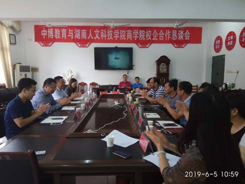 65日上午,商学院在同德楼会议室召开中博教育校企合作恳谈会。中博教育集团董事长毛金明一行4人莅临指导,校地校企合作处负责人,商学院全体院领导、教研室主任等参加了会议。会议由校地校企合作处处长黎建辉主持。