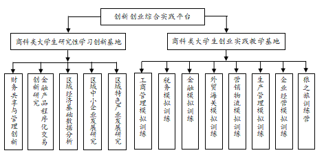 中心简介(限2000字以内):(包括建设历史、中心构成、支撑条件、管理体制、创新创业教育改革、课程教学资源、网络平台等情况)。 1.建设历史 商科类专业创新创业教育中心是以工商管理类、电子商务类、旅游管理类、物流管理与工程类、金融学类等专业创新创业教育为主线,依托工商管理类专业大学生创新训练中心,着力搭建商科类专业学生自主学习的创新创业教育实践平台。中心借助湖南省市场营销类专业校企合作人才培养示范基地(2012)、湖南省教育信息化试点项目平台(2014)、湖南省管理类专业校企合作创新创业教育基地(2016)、湖南省市场营销类专业校企合作创新创业教育基地(2016)、湖南省十三五综合改革试点专业——电子商务专业(2016)等6个省级平台、应用经济学校级重点学科、3个研究所(企业管理研究所、区域经济发展研究所和电子商务研究所)和校企共建集团财务共享实验室、集团财务管控实验室、电子商务创业实验室、跨专业综合实训室、狼之旅训练营等创新创业实践平台,以及金蝶软件(中国)公司等提供的高层次专业技术人员作为指导教师和创新创业教育相关的课程与实践教学资源等,创新了校企合作环境下的大学生创新创业教育,为今年会商科类专业的创新创业教育提供良好的平台。 2.中心构成 目前商学院实验实训中心设置有电子商务、物流仿真、集团财务共享与财务管控、人力资源管理、模拟导游、跨专业综合实训、企业经营模拟、营销沙盘与经济学沙盘等19间实验室,中心构建了由“商科类专业大学生创业实践教学基地”和“商科类专业大学生研究性学习创新基地”组成的创新创业综合实验平台,如图1所示,开展创新创业教育实践。
