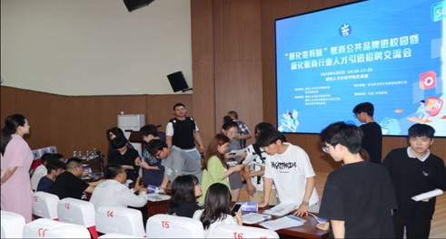现场,湖南禾晖文化传媒有限公司、小小鸟电子科技有限公司、湖南丰谷食品股份有限公司、新化焦点文化传媒有限公司、新化县天龙山农林科技开发有限公司等5家新化县数字商务协会会员企业负责人进行双选交流发言,并架设企业咨询展台,为电商学子实习就业开通零距离答疑渠道。活动现场人潮涌动,求职者络绎不绝,特别是“电商运营”岗位成为同学们关注的热点。