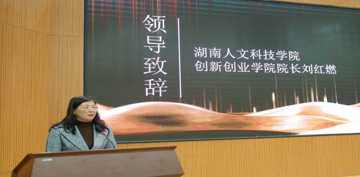 创新创业学院院长刘红燃致辞,她提出,创新创业现处于百年未有之大变局,我们应积极响应创新创业总布局,进一步深化创新创业思想,提升自己的能力和素质。她希望参赛者和观赛者都可以通过此次比赛提高对互联网直播的认识,提升创业带动就业能力。