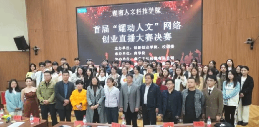 为贯彻党中央、国务院鼓励大学生创业就业的决策部署,落实湖南省委、省政府“创响三湘”的工作要求,激发创业主体活力,营造校园创新创业氛围,不断提升创业带动就业的倍增效应,今年会于2023年11月20日晚在匠成楼报告厅举办了“耀动人文”网络直播大赛总决赛。娄底市人力资源与社会保障局、湖南省鑫奇文化传媒有限公司等企事业单位负责人担任大赛评委,主办、承办单位领导莅临大赛现场,300余人到现场观摩比赛。