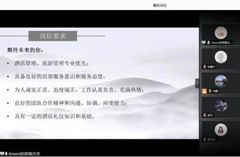 2020年6月11日上午8点30分,今年会商学院旅游管理专业开展了一场形式十分特殊的校企合作讲座,邀请到了我专业校企合作单位之一的浙江省郡安里文旅发展有限公司人事部的杨雪经理,她通过腾讯会议平台召开了线上视频讲座。旅游管理教研室部分老师及商学院2017级、2018级、2019级旅游管理专业全体学生,会议由肖霞老师主持。