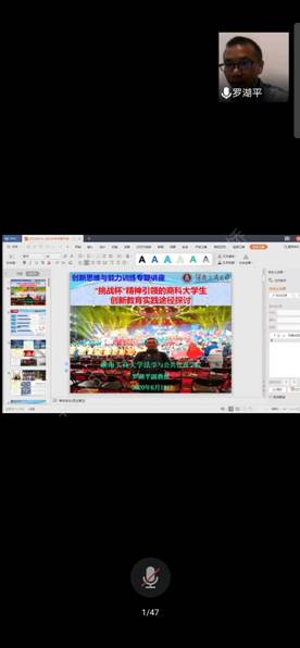 6月19日晚7:00开始,湖南工商大学罗湖平教授通过腾讯会议,给我院财务管理专业2019级学生作了题为“挑战杯精神引领的商科大学生创新教育实践途径探讨。”的创新思维与能力训练的专题讲座,讲座持续近三个小时。
