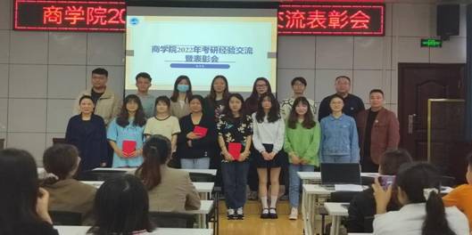 5月27日下午,商学院在高韵楼101举行2022届考研经验交流暨表彰会,党总支书记刘辉,副院长王晓军,副书记胡益龙出席,2022届考研录取学生代表、19级20级部分学生参会,曾文果主持。