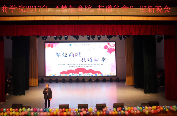 12月28日晚,商学院在逸夫楼音乐厅举行了“梦起商院•共谱华章”迎新晚会。商学院全体领导、老师、团学干部和17级新生参加了晚会。学校学生会和各学院学生会部分干部应邀参加了晚会。