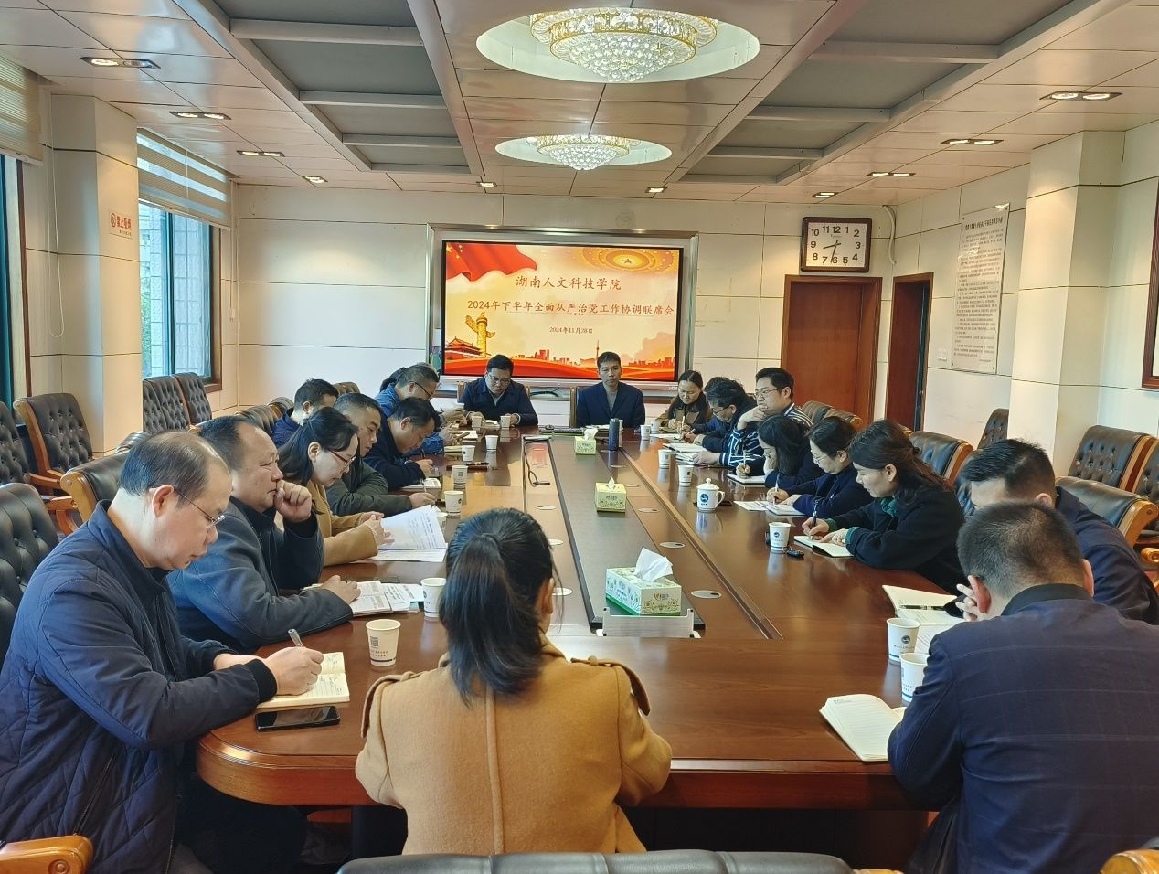 11月28日上午,今年会在明德楼第一会议室召开2024年下半年全面从严治党工作协调联席会,校党委委员、纪委书记、省监委驻校监察专员凌艳平出席会议并讲话。相关职能部门主要负责人参加会议。会议由纪委副书记、监察专员办公室主任、巡察办公室主任江彤主持。