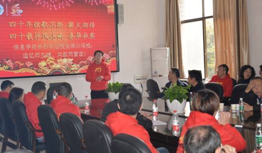 座谈会由信息学院党总支副书记刘辉主持,党总支书记谭甲凡致欢迎词:热烈欢迎名位校友荣归母校,共商发展大计;从办学规模、师资队伍建设、学科专业建设、实验室建设及人才培养质量等向与会人员作了简要介绍;希望校友在祖国的大江南北、各行各业建功立业,再创佳绩。他说:“今天我们向社会各界、向师生、向校友展示了学校改革开放40年的办学成果,为校友、老师交流搭建了畅谈的平台,共叙母校情,共话师生谊。这是一次情真意切的聚会,是一次“人才至上,仁爱满园”的交融,是一次“学术校庆、文化校庆、校友校庆、合作校庆”的盛宴,是一次展望未来争取更大胜利的促进会,希望校友们常回母校看看”。原学校组织部长、副校级督导,原信息学院领导(曾任计算机系主任、总支书记)李高海研究员,满怀深情回忆学校开创初期的创业经历,特别提出要感谢创业初期老教师的辛苦付出,希望学校越办越红火。校友们在会上畅所欲言,向母校汇报自己工作、生活和取得的成就,感谢老师们的谆谆教诲,感恩母校的培养,对母校的工作提出了很多好的建议。