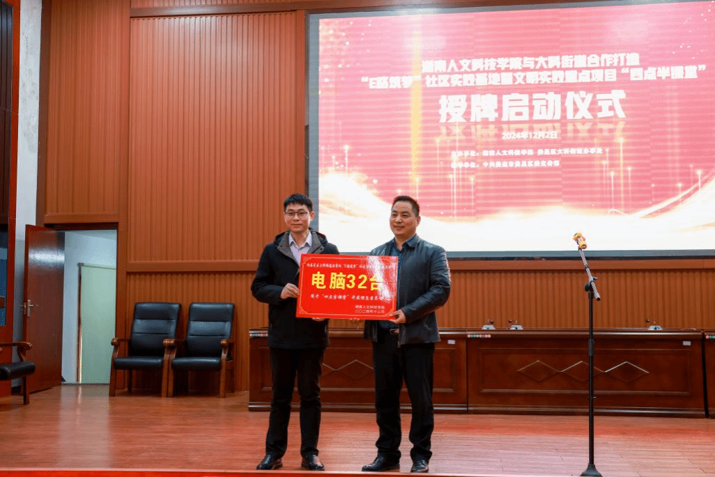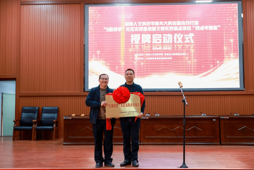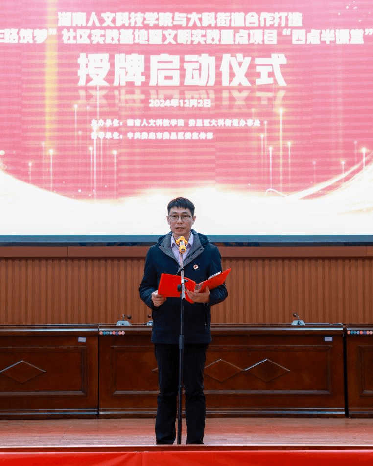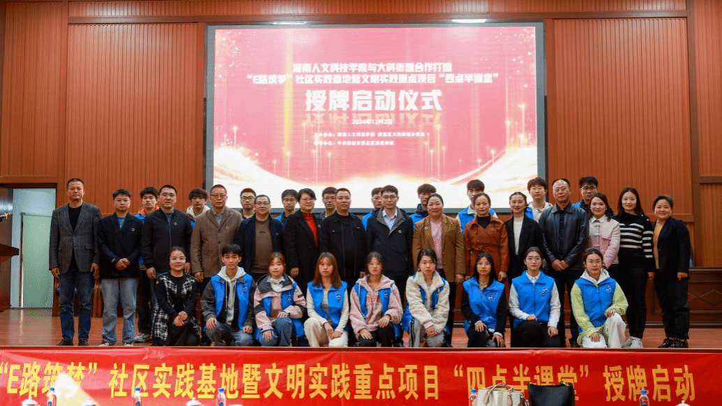 12月2日,今年会与大科街道合作打造的“E路筑梦”社区实践基地暨文明实践重点项目“四点半课堂”开班启动授牌仪式在大科街道礼堂隆重举行。今年会党委委员、副校长谭峰亮,娄星区委常委、宣传部长曾海军等领导出席授牌仪式。