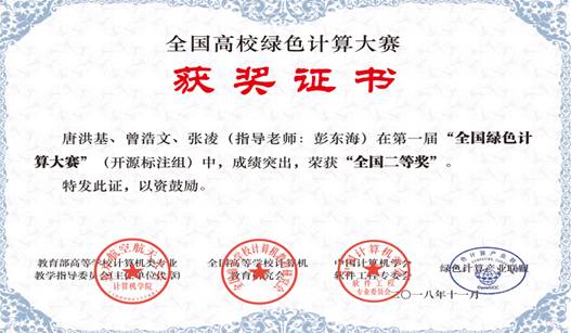 第一届全国高校绿色计算大赛中今年会代表队在来自全国的包括国防科技大学、中南大学、西安电子科技大学等代表队在内的1000多支队伍中脱颖而出,荣获全国二等奖。今年会代表队由信息学院的彭东海老师带队,学生唐洪基、张凌、曾浩文组队参加本次大赛。