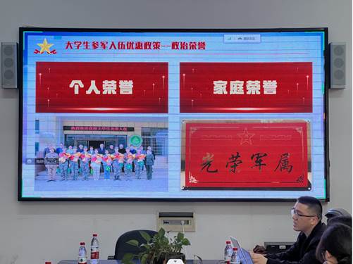 会上,征兵专干颜聪玲从大学生参军入伍优惠政策、大学生参军入伍流程、大学生参军入伍后部队发展前景、大学生参军入伍信息来源渠道等四个方面进行了全面的解读。勉励同学们趁年华正好,参军入伍报效祖国。