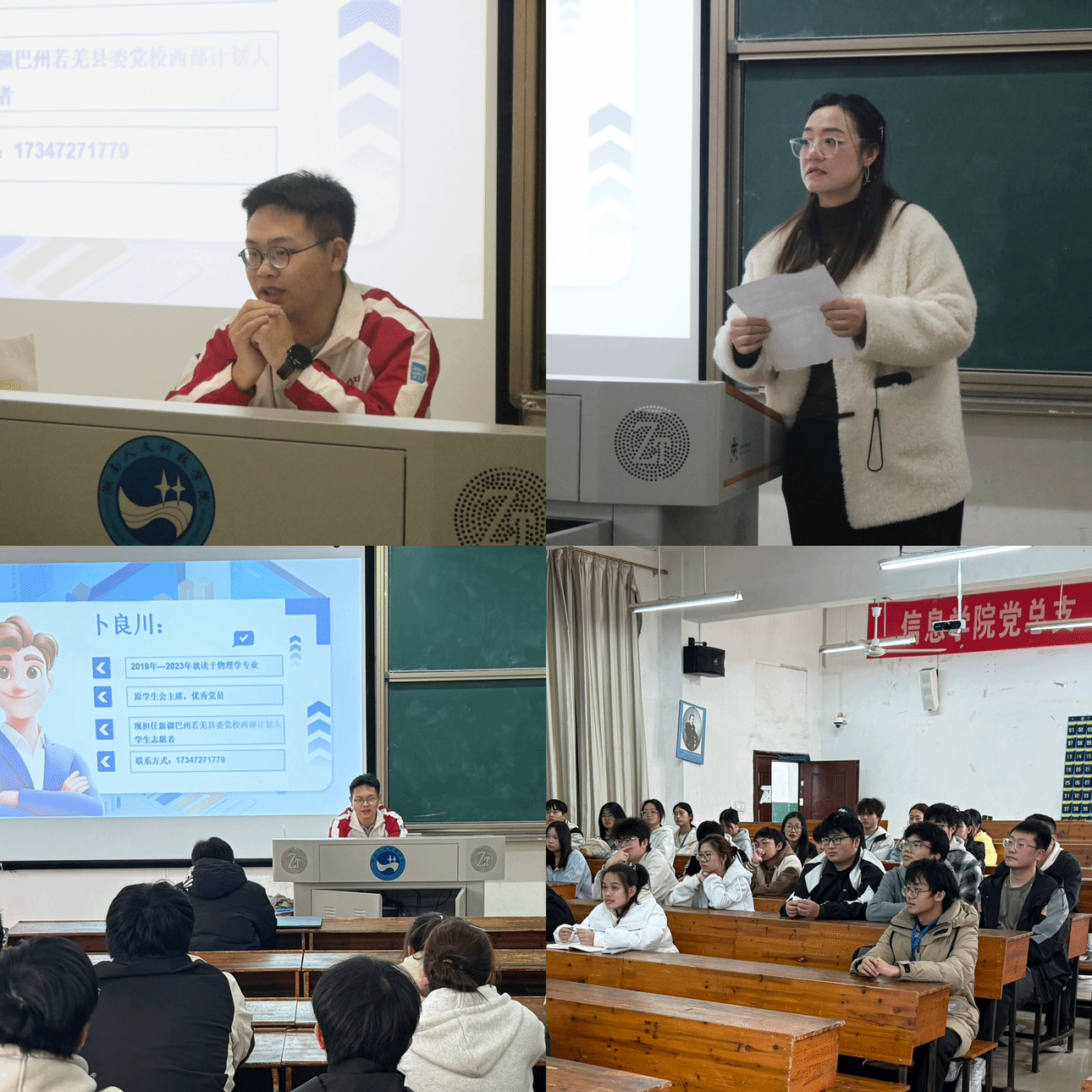 3 月 18 日 信息学院 23 届校友卜良川,作为西部计划志愿者重返母校,于百全楼 103 教室开展就业讲座,为学弟学妹们传经送宝。