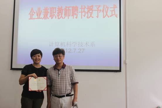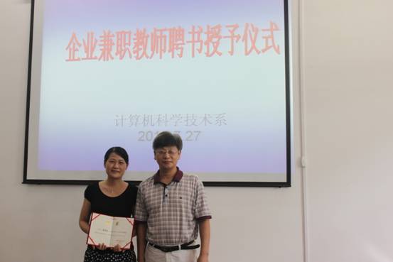 人事处处长郭育清同志为夏晓曼女士颁发计算机系兼职教师聘书