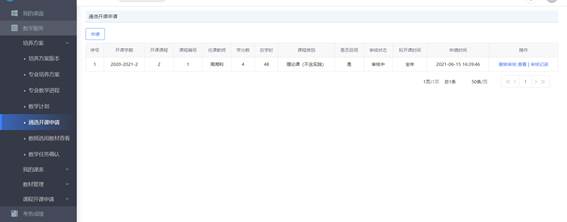 3、 进入【通选课开课申请】界面后点击左上角的【申请】进入开课申请操作界面。