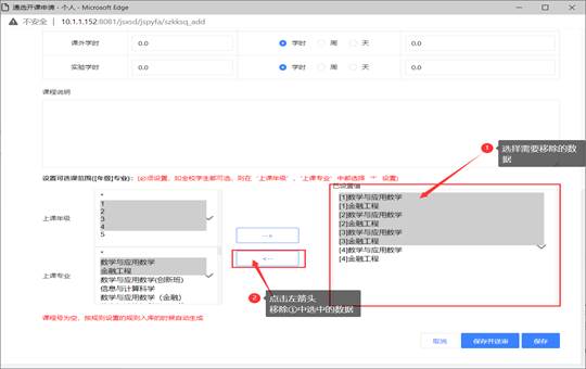 选中左上角的【新增】按钮后,补充完整各项开课信息,将课程编号输入上去。注意:课程信息一定要填写完善,以免之后进行开课安排时不必要的修改操作。【课程编号】按学校实际编号手动输入(参照2019版人才培养方案。新开设的课程由教务处提供课程编号。)不要点击自动生成。课程信息补充完整后,选中【上课专业】以及【上课年级】点击【右移箭头】将信息置入已设置值中。置入的信息有误,则选择已经置入的数据然后点击【左移箭头】将这些数据从已设置的值中移除。