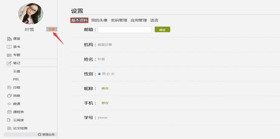 基本资料设置,同学们通过本页设置可以实现绑定邮箱、填写手机号的功能。