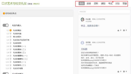 D、空间中还包括了统计,资料,作业,考试和讨论功能。在界面右侧,同学们可以参与讨论,查看通知,查看同学,下面分别进行介绍。