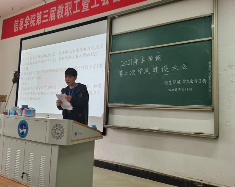 为更好地让学生们熟悉学风,加强班级班风建设,信息学院学习会学习部于4月13日中午在百全楼103举办了本学期第二次学风建设大会。参会人员包括教务办老师蔡伟华,学工办老师朱舒腊、袁微,19、20级各班班长学委,学习部干事以及迟到旷课扣分达到四分以上的同学等。