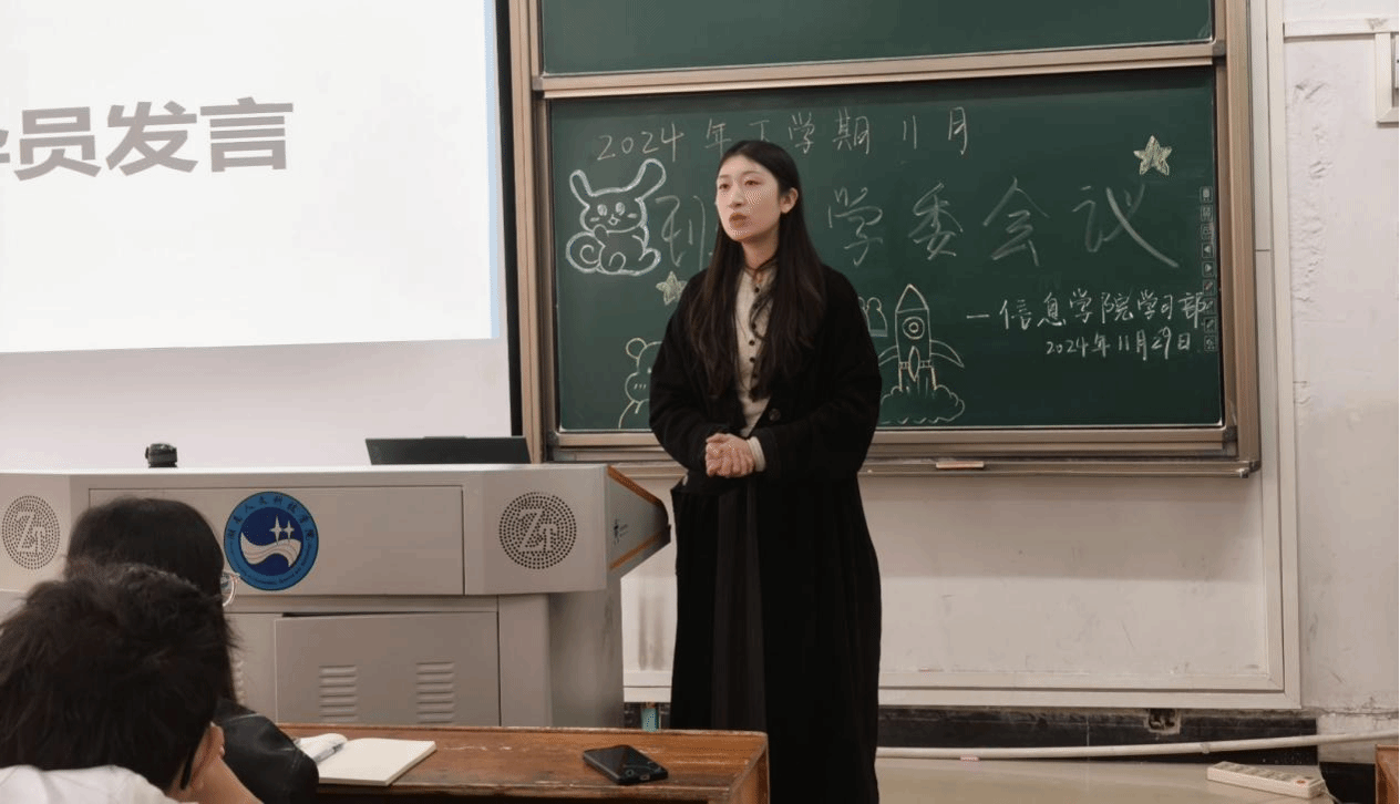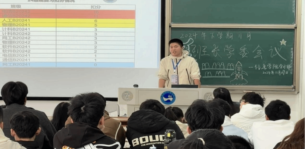 为进一步做好学院学风建设工作,信息学院于2024年11月29日中午12点40分于百全楼103教室召开了学风建设大会,主要针对十一月发现的问题进行了深入剖析。信息学院党总支副书记朱舒腊老师、辅导员、团学会部长代表及22~24级班长学委。