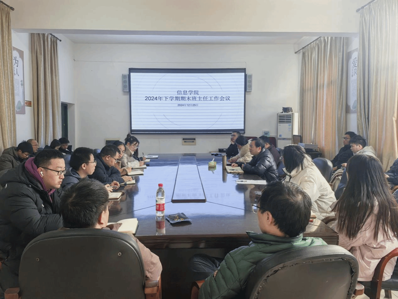 12月25日,为确保学院期末教学秩序的稳定及平安校园的建设,信息学院召开期末班主任工作会议。全院班主任及辅导员、党总支书记刘凤龙、党总支副书记朱舒腊参会,学工办主任颜聪玲主持。