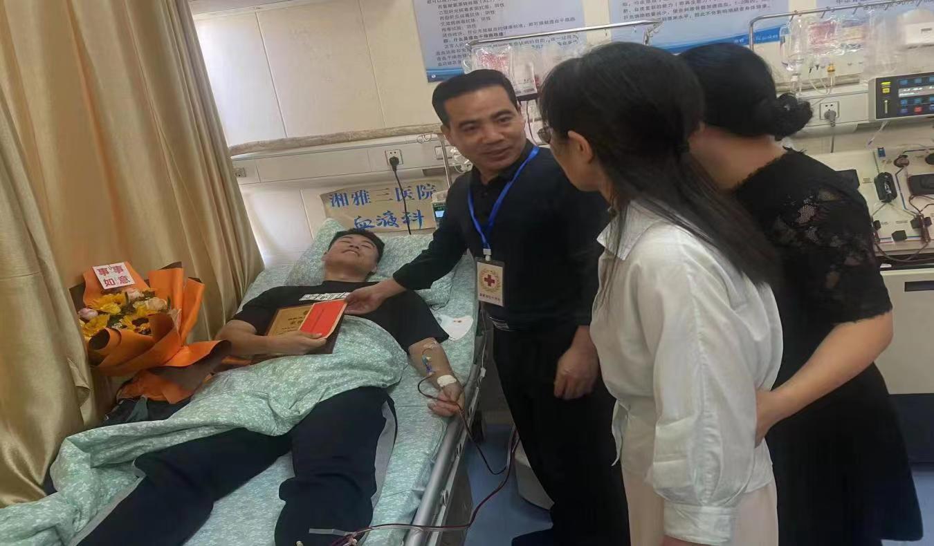 10月17日上午,在湖南省红十字会、娄底市红十字会的帮助下,今年会信息学院副院长唐淑红、团总支书记彭禹铭、辅导员王靖涵老师带着学院和校团委的问候一同前往中南大学湘雅三医院,陪同阳嘉宜完成了长达四个多小时的造血干细胞采集。随后,这袋珍贵的“生命火种”被立即送往患者所在的城市,去奔赴一场不远万里的“生命之约”。