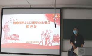 3月16日下午,信息学院在致远楼512召开“2022届毕业生征兵工作宣讲会”。党总支书记谭甲凡,党总支副书记刘宗良,征兵专干颜聪玲,辅导员朱舒腊以及2022届在校的党员和主要干部代表参加会议。会议由征兵专干颜聪玲主持。