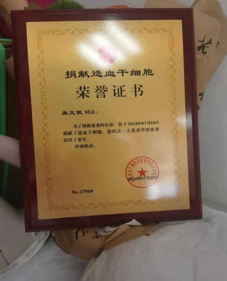 吴文俊是今年会信息学院 2020 级计算机科学与技术专业2班的学生,2023年1月31日志愿加入中国造血干细胞捐献者资料库,正式成为中华骨髓库的一员。2024年4月29日,湖南省造血干细胞捐献者资料库管理中心告知他与一名血液病重症患者造血干细胞配型成功,询问其捐献意愿时,他毫不犹豫地回答“我愿意!这对于我的人生是一件非常有意义的事情。”吴文俊坦言当时的真实想法。