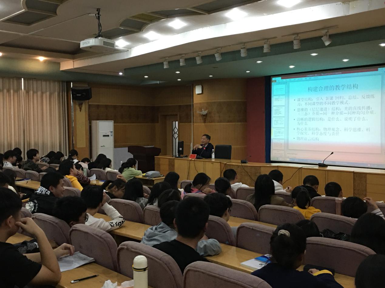 何蓁研究员是湖南省教育科学研究院物理教研员,湖南师大物理学院硕士生导师,湖南省物理学会副理事长,湖南省创造学会副理事长。在报告中,何蓁研究员主要从以下几个方面进行了阐述:科学合规地选择教学目标;构建合理的教学结构;选择最适合的教学方式;优化教学手段,提供真实情境;营造良性互动的学习氛围;精心选择习题,引导自主建构;适时评价反馈,追求效益与效果;积极反思。针对每一个内容,他都以生动的实际案例加以阐述说明,使在座的师生深受启迪。对如何进行教学设计有了更深刻的领悟和理解。